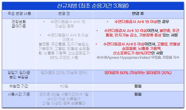 AHI 5 이상이면서, 고혈압, 빈혈성 심장질환, 뇌졸중 기왕력, 산소포화도가 85%미만인 사람으로 기준이 좀 더 까다로워졌죠